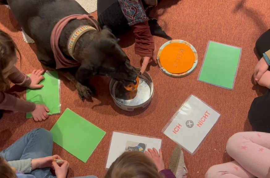Der erste Kontakt mit Rani erfolgte strukturiert und beobachtend. Die Kinder nahmen zunächst Abstand ein und richteten ihre Aufmerksamkeit auf Ranis Kommunikationssignale. Annäherung und Interaktion fanden freiwillig und im individuellen Tempo statt. Diese Vorgehensweise förderte Selbstwirksamkeit, Empathie und ein achtsames Miteinander – sowohl gegenüber dem Hund als auch innerhalb der Gruppe.
